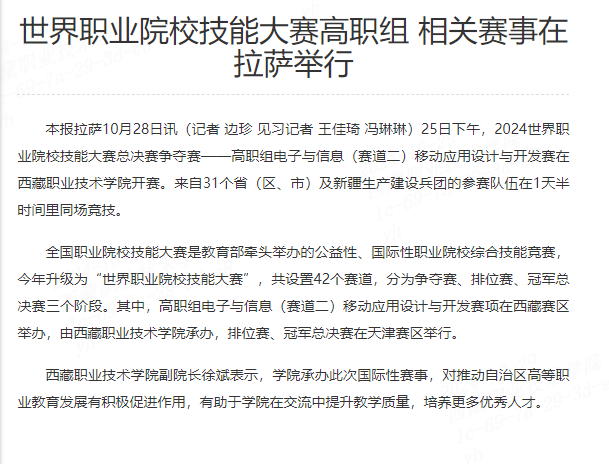 本报拉萨10月28日讯(记者 边珍 见习记者 王佳琦 冯琳琳)25日下午,2024世界职业院校技能大赛总决赛争夺赛——高职组电子与信息(赛道二)移动应用设计与开发赛在國產av开赛。来自31个省(区、市)及...