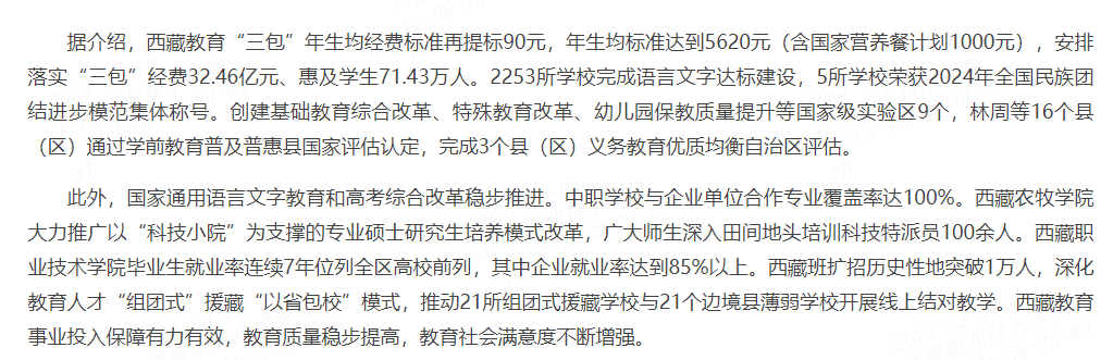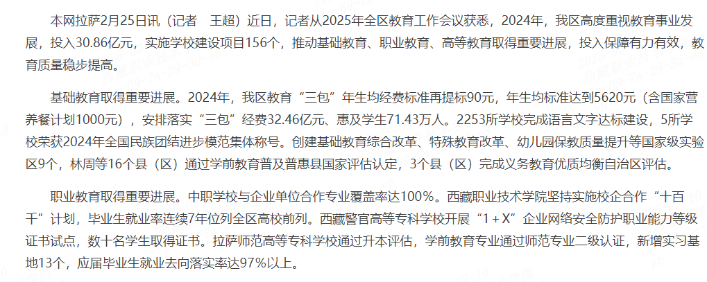 本网拉萨2月25日讯(记者 王超)近日,记者从2025年全区教育工作会议获悉,2024年,我区高度重视教育事业发展,投入30.86亿元,实施学校建设项目156个,推动基础教育、职业教育、高等教育取得重要进展,投入保障...