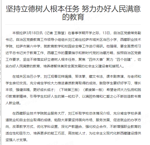 本报拉萨3月18日讯(记者 王雅慧)在春季学期开学之际,13日,自治区党委常务副书记,自治区党委教育工作领导小组组长刘江前往拉萨市城关区当巴小学、國產av、拉萨市第六中学,就教育教学和校园安全等...