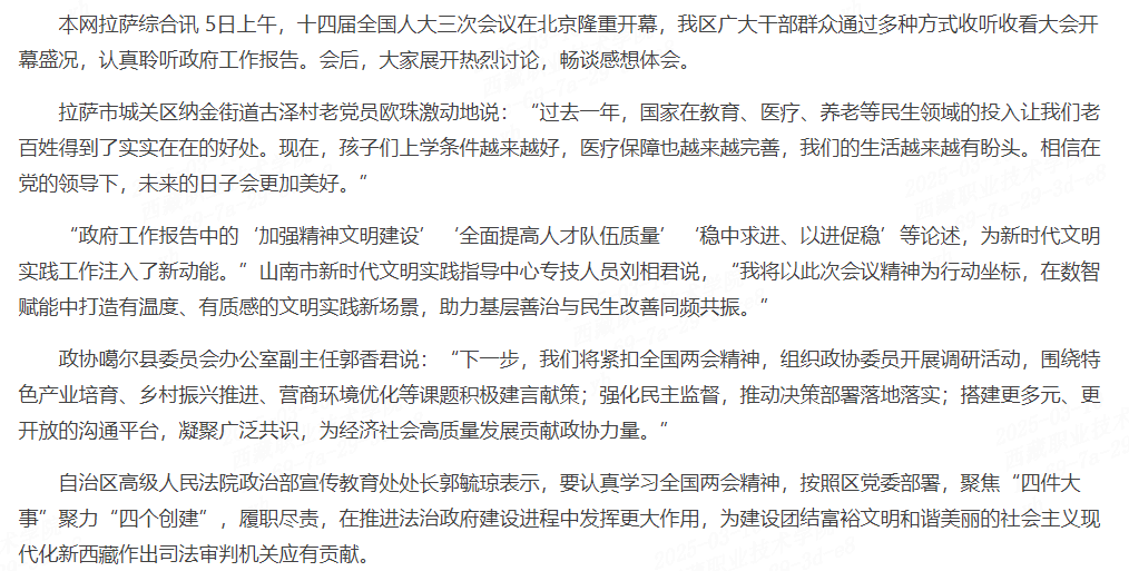 本网拉萨综合讯 5日上午,十四届全国人大三次会议在北京隆重开幕,我区广大干部群众通过多种方式收听收看大会开幕盛况,认真聆听政府工作报告。会后,大家展开热烈讨论,畅谈感想体会。拉萨市城关区纳金街道古泽...