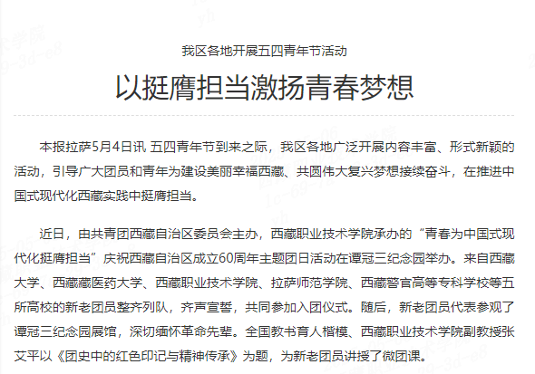 本报拉萨5月4日讯 五四青年节到来之际,我区各地广泛开展内容丰富、形式新颖的活动,引导广大团员和青年为建设美丽幸福西藏、共圆伟大复兴梦想接续奋斗,在推进中国式现代化西藏实践中挺膺担当。近日,由共青团西...