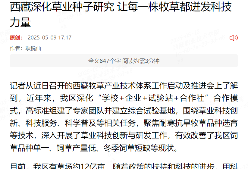 记者从近日召开的西藏牧草产业技术体系工作启动及推进会上了解到,近年来,我区深化“学校+企业+试验站+合作社”合作模式,高标准组建了专家团队并建立综合试验基地,围绕草业科技创新、科技服务、科学普及等相关...