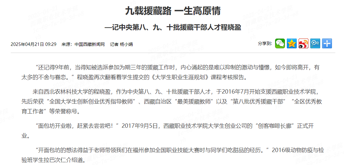 “还记得9年前,当得知被选派参加为期三年的援藏工作时,内心涌起的是难以抑制的激动与憧憬,如今即将离开,有太多的不舍与眷恋。”程晓盈再次翻看着学生提交的《大学生职业生涯规划》课程考核报告。来自西北农林...