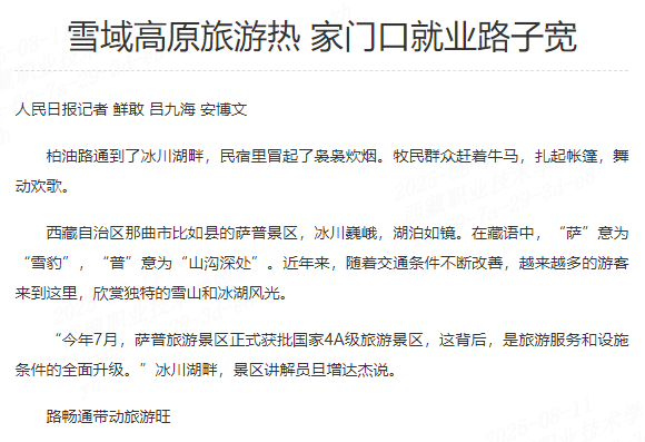 人民日报记者 鲜敢 吕九海 安博文柏油路通到了冰川湖畔,民宿里冒起了袅袅炊烟。牧民群众赶着牛马,扎起帐篷,舞动欢歌。西藏自治区那曲市比如县的萨普景区,冰川巍峨,湖泊如镜。在藏语中,“萨”意为“雪豹”,...