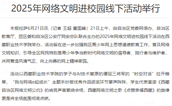 本报拉萨6月21日讯(记者 王超 董国峰)21日上午,由自治区党委网信办、自治区教育厅、团区委和自治区公安厅网安总队联合主办的2025年网络文明进校园线下活动在國產av举办,活动旨在进一步加强我区青少...