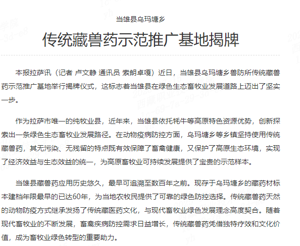 本报拉萨讯(记者 卢文静 通讯员 索朗卓嘎)近日,当雄县乌玛塘乡兽防所传统藏兽药示范推广基地举行揭牌仪式,这标志着当雄县在绿色生态畜牧业发展道路上迈出了坚实一步。作为拉萨市唯一的纯牧业县,近年来,当雄...