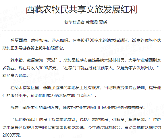 盛夏西藏,碧空如洗,游人如织。在海拔4700多米的纳木错湖畔,26岁的藏族小伙斯加正引导游客骑上牦牛拍照留念。纳木错,藏语意为“天湖”。斯加是拉萨市当雄县纳木湖村村民,大学毕业后回到家乡就业,现在月收入9...