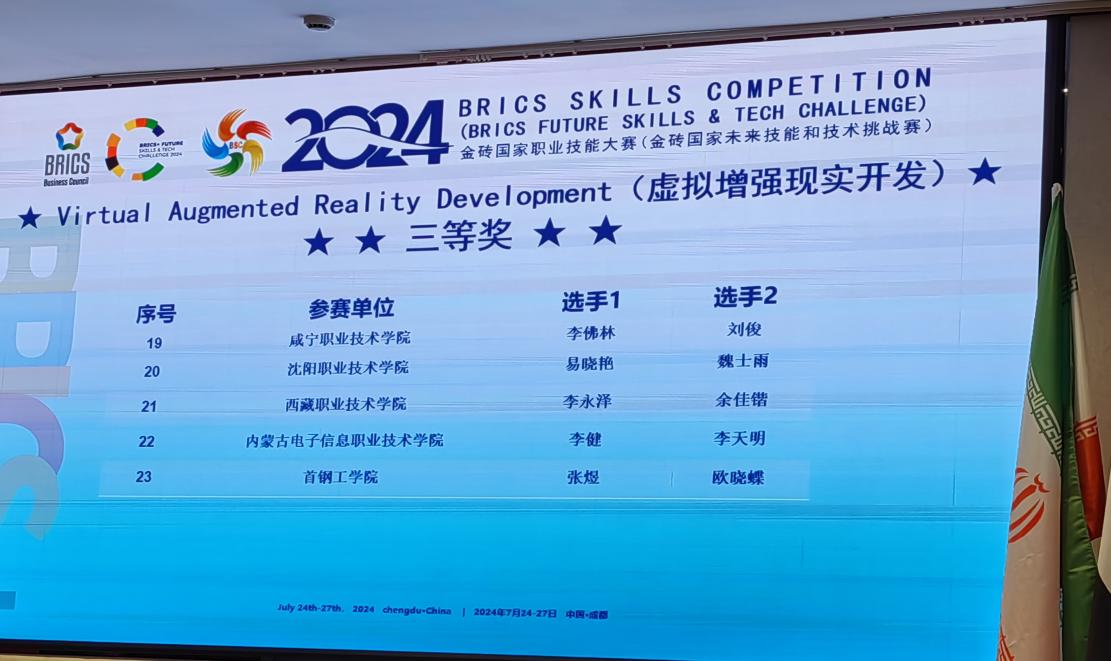 7月24日-7月27日,2024金砖国家职业技能大赛(金砖国家未来技能和技术挑战赛)虚拟增强现实开发赛项全国选拔赛暨国内决赛在成都市技师学院举行。國產av建筑工程学院学生李永泽、余佳锴荣获国赛三等奖。