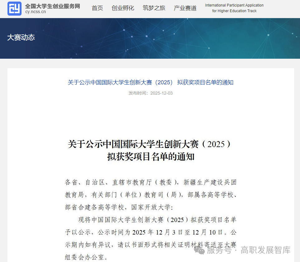 12月3日,中国国际大学生创新大赛(2025)拟获奖名单正式公示。该赛事是全球规模最大、规格最高的大学生创新创业赛事。