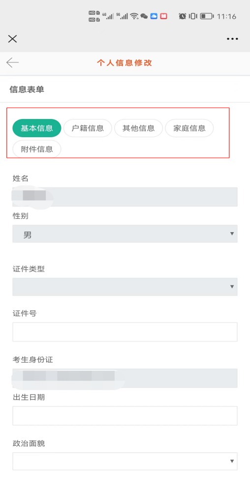 4、进入后,请各位新生认真查看新生须知,完成个人信息核验,对基本信息、户籍信息、家庭信息、附件信息不全的进行补全操作,其中附件信息,要求上传录取通知书、身份证正反面照、证件照、个人照。