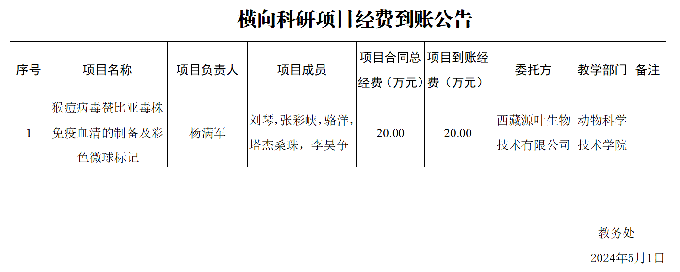 横向科研项目经费到账公告