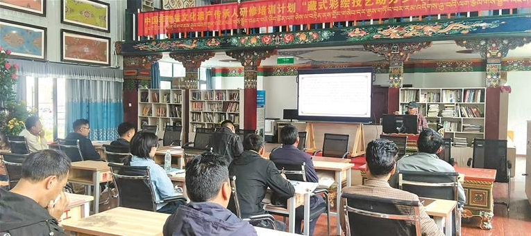 加措在“藏式彩绘技艺助力乡村振兴技能研修班”中为学员讲解传统藏式木雕和彩绘技艺。