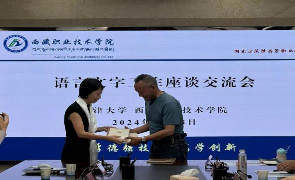 会上,吕静同志以天津大学国家通用语言文字推广基地申报情况、建设规划为主题作交流发言;群培次仁同志就我院语言文字工作基本情况进行了详细介绍;双方语言文字相关工作人员围绕创意写作、推普与专业融合、推普助力乡村振兴及经典诵读活动等具体工作交流经验,协商合作方向。吕静同志代表天津大学国家通用语言文字推广基地向我院语言文字推广基地赠书。