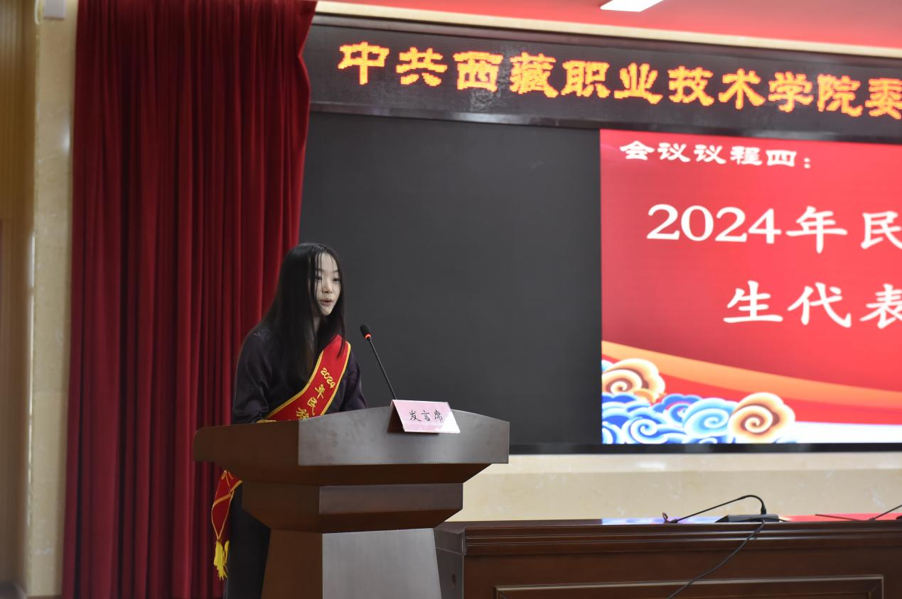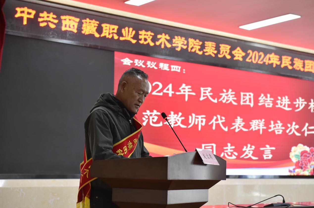 图为民族团结进步示范学院代表德吉同志发言