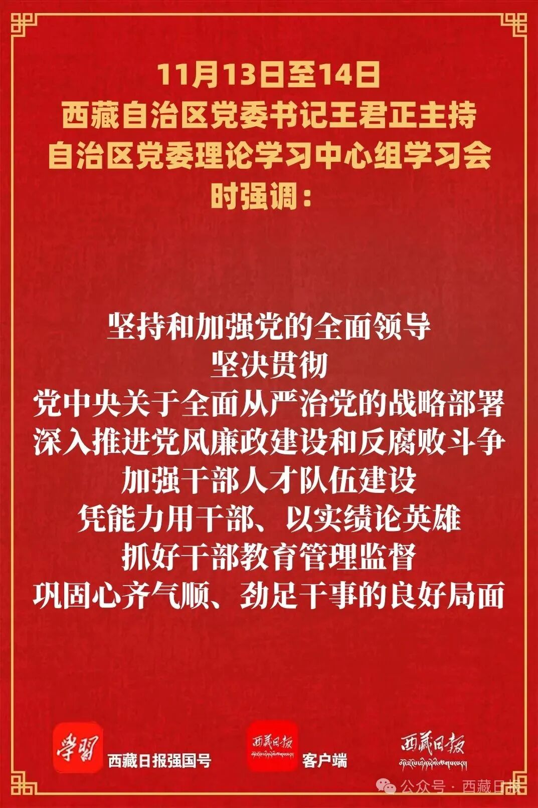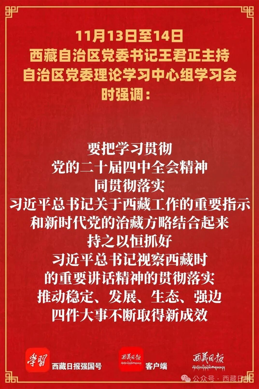 11月13日至14日,自治区党委理论学习中心组举行党的二十届四中全会精神学习会,自治区党委书记王君正主持会议,强调要全面系统学习贯彻党的二十届四中全会精神,切实把学习成果转化为抓好“四件大事”的强大动力,努力建设社会主义现代化新西藏。